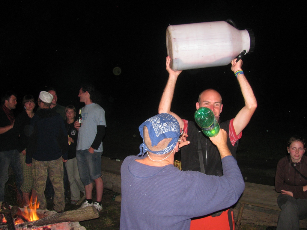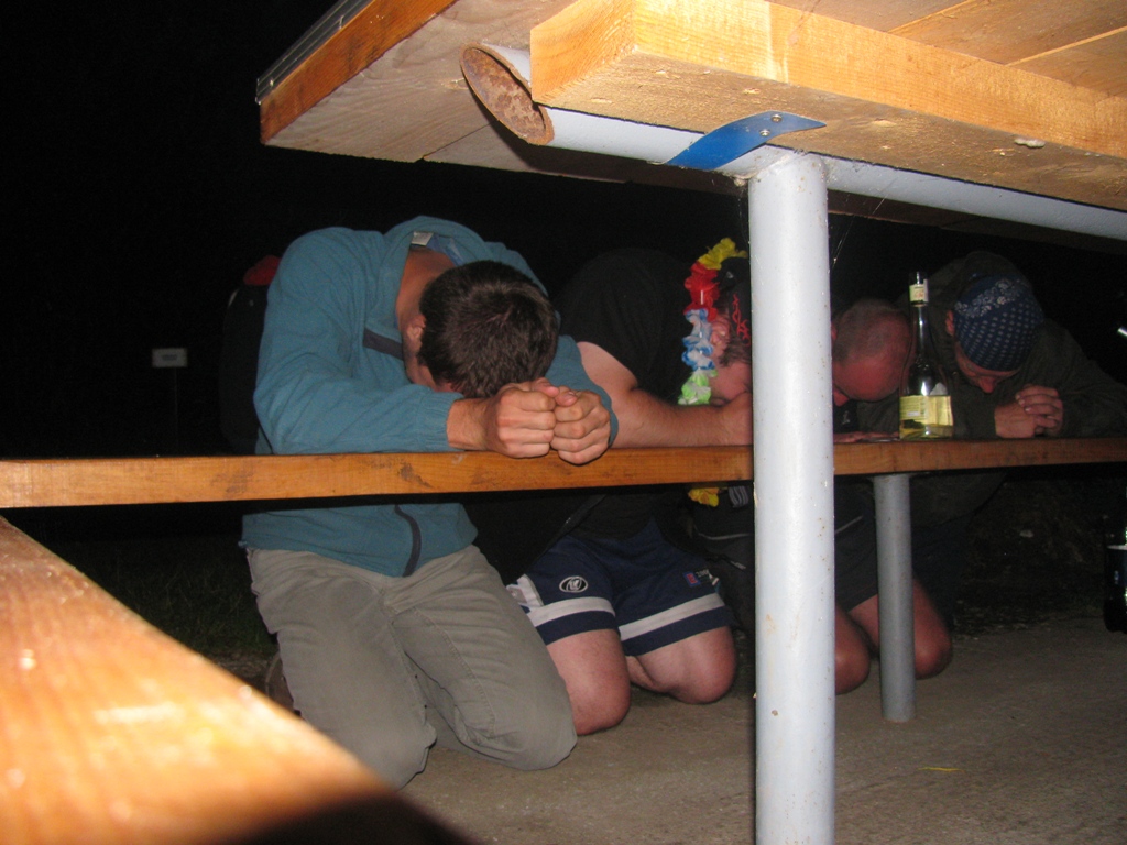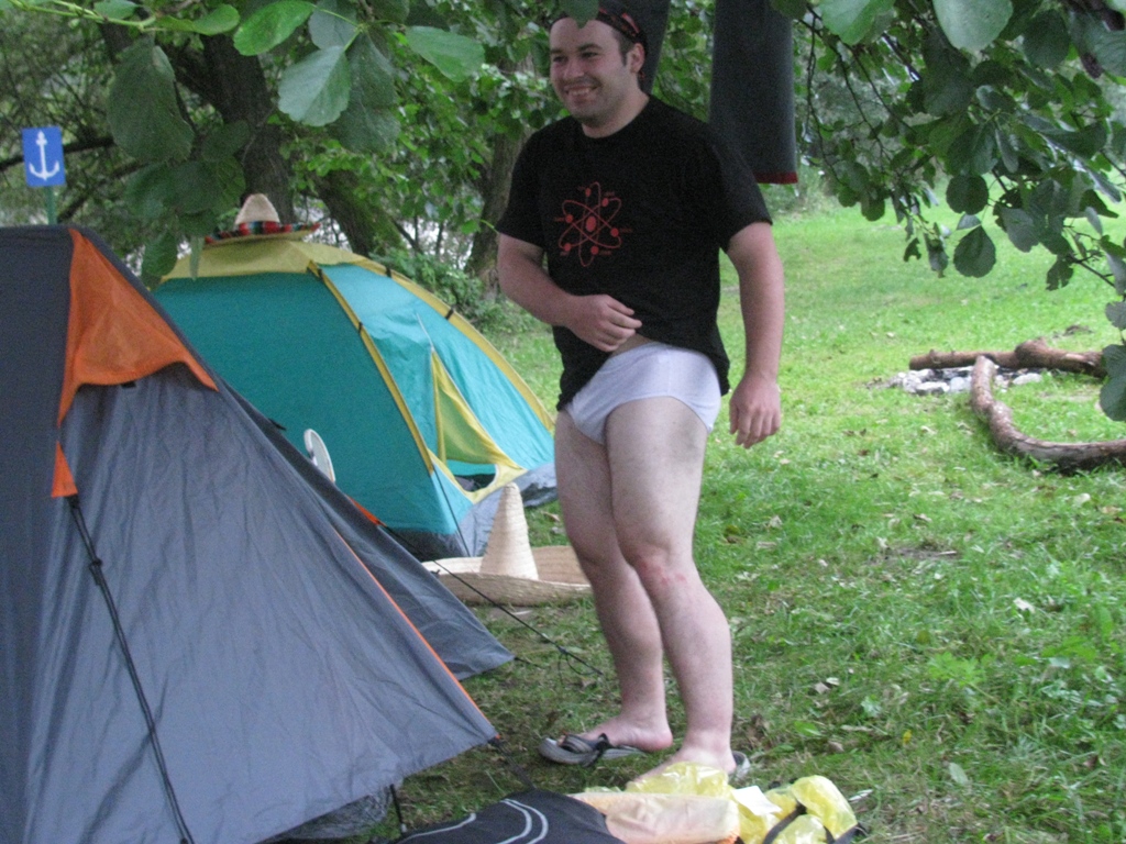 Na ďalší deň sme už boli plní rešpektu. Hať v Lupči sme preniesli, až na Hrocho s Pučkom Hruškom, ktorí neváhali a zlava si to tadiaľ prepádlovali. Hať pred Šalkovou však už neprešiel nikto. Voda tam tak hučala že sme radšej zastali 50 metrov pred haťou. Kedže sa k hati nedalo dostat, rozhodli sme sa lode preniesť. Tie sme však najskôr museli vytiahnuť 5m do kopca cez žihlavu. To bolo niečo. Doprhalvení jak hovadá sme sa nalodili 50m pod haťou, no keď Pučko Hruško zbadal z vody čo sme prenášali tak si chcel radšej hlavu roztrepať o kamene. Za 2 minutky sme už boli na Šalkovej, v starej známej krčme otvorenej od nevidím do nevidím. Hrocho konečne dostal suché trenky, ktoré mu kúpili v TESCU, a dokonca do boli čipkované ženské bombarďáky. V krčme sa prehnalo stádo miešaných, pred ktorými sa potom Hrocho v kempe len hodil na kolená a modlil sa k Xavimu, to ešte nevedel ako dobre spravil a že modlitba bude na druhý deň vypočutá.